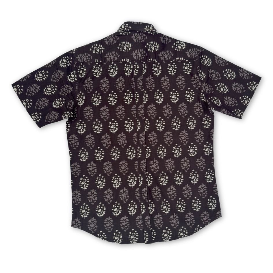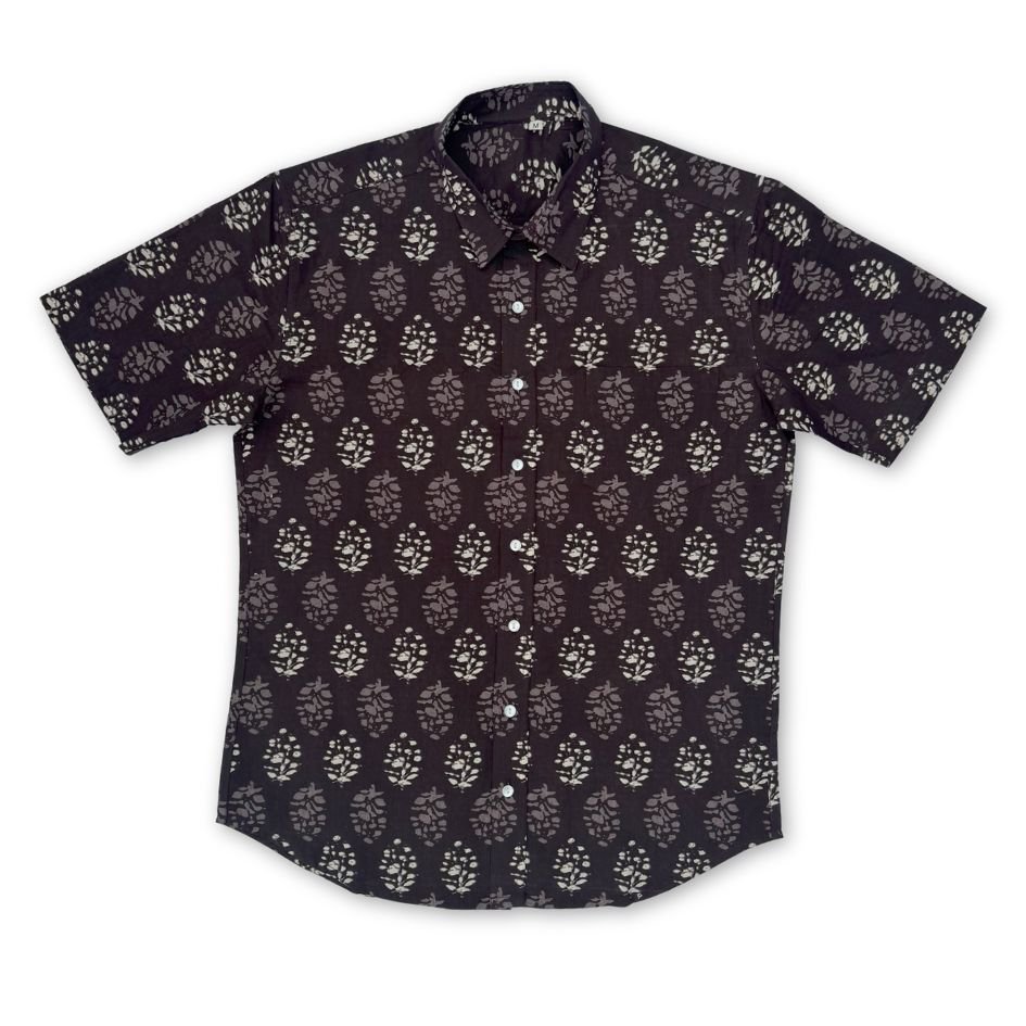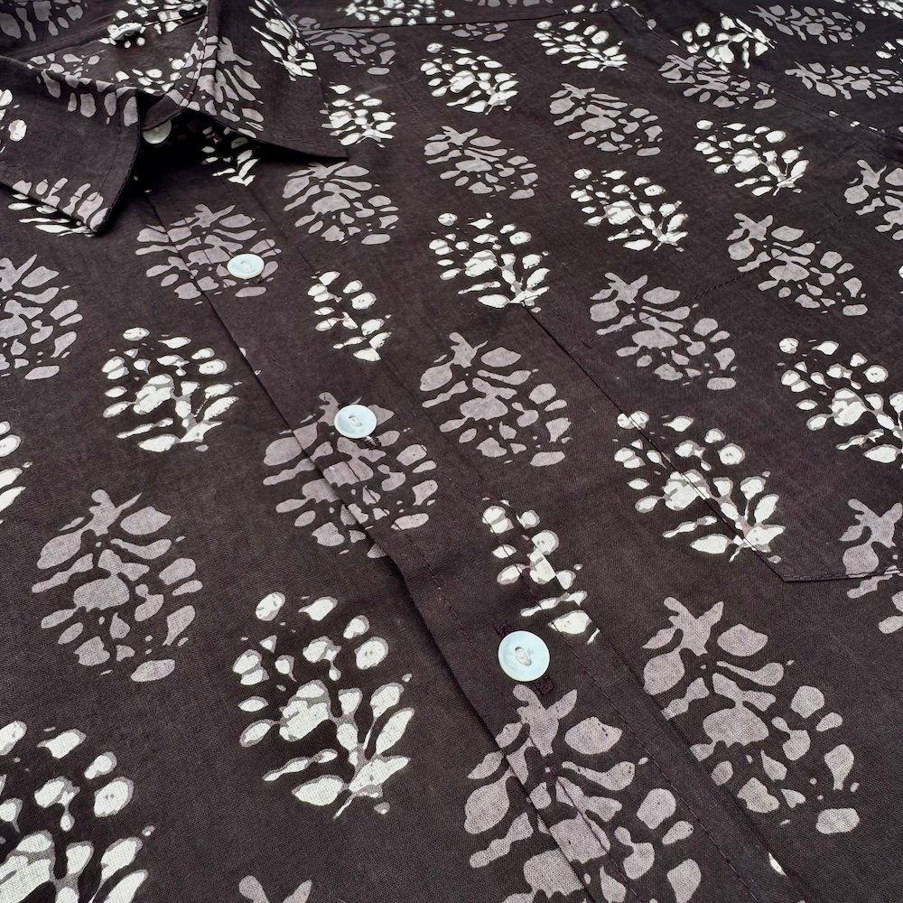 Cotton shirt hand printed by wood blocks. Natural dyes are used while dying the fabric. Due to them being printed by hand, small imperfections are present in the shirt. These bring the design to life and make each shirt one of a kind. Our shirts are made in Jaipur, India—a city renowned for its centuries-old tradition of block printing. Each piece reflects the care, skill, and heritage of artisans who continue this time-honored craft using hand-carved wooden blocks and plant-based dyes.