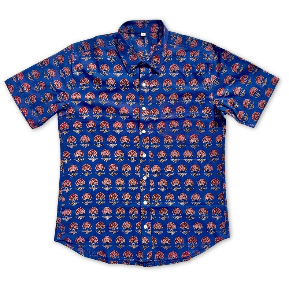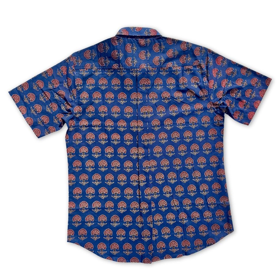 Cotton shirt hand printed by wood blocks. Natural dyes are used while dying the fabric. Due to them being printed by hand, small imperfections are present in the shirt. These bring the design to life and make each shirt one of a kind. Our shirts are made in Jaipur, India—a city renowned for its centuries-old tradition of block printing. Each piece reflects the care, skill, and heritage of artisans who continue this time-honored craft using hand-carved wooden blocks and plant-based dyes.