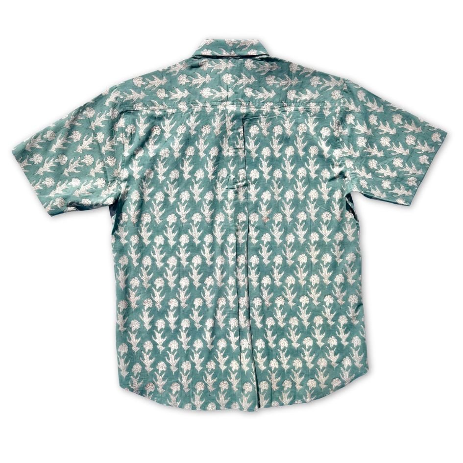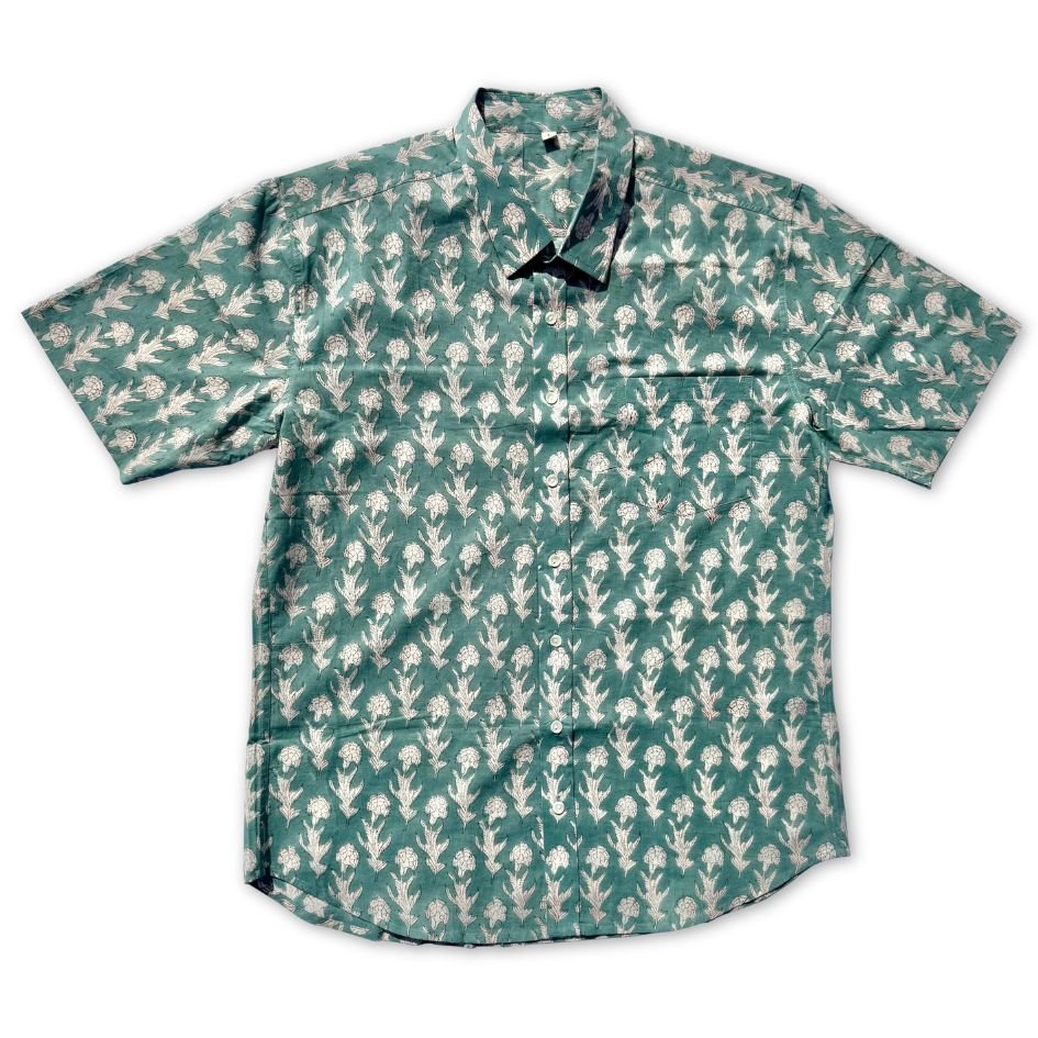 Cotton shirt hand printed by wood blocks. Natural dyes are used while dying the fabric. Due to them being printed by hand, small imperfections are present in the shirt. These bring the design to life and make each shirt one of a kind. Our shirts are made in Jaipur, India—a city renowned for its centuries-old tradition of block printing. Each piece reflects the care, skill, and heritage of artisans who continue this time-honored craft using hand-carved wooden blocks and plant-based dyes.