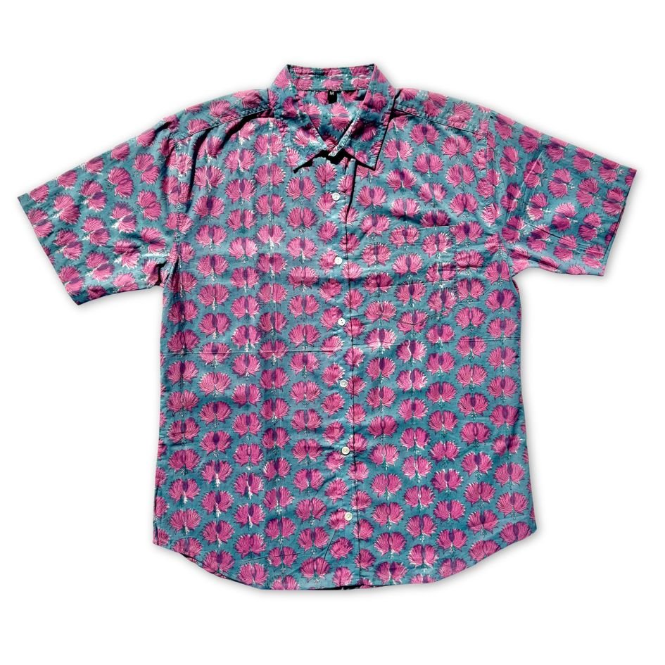 Cotton shirt hand printed by wood blocks. Natural dyes are used while dying the fabric. Due to them being printed by hand, small imperfections are present in the shirt. These bring the design to life and make each shirt one of a kind. Our shirts are made in Jaipur, India—a city renowned for its centuries-old tradition of block printing. Each piece reflects the care, skill, and heritage of artisans who continue this time-honored craft using hand-carved wooden blocks and plant-based dyes.