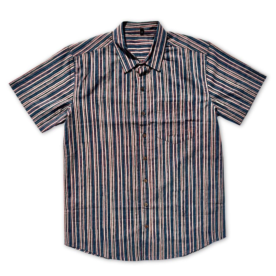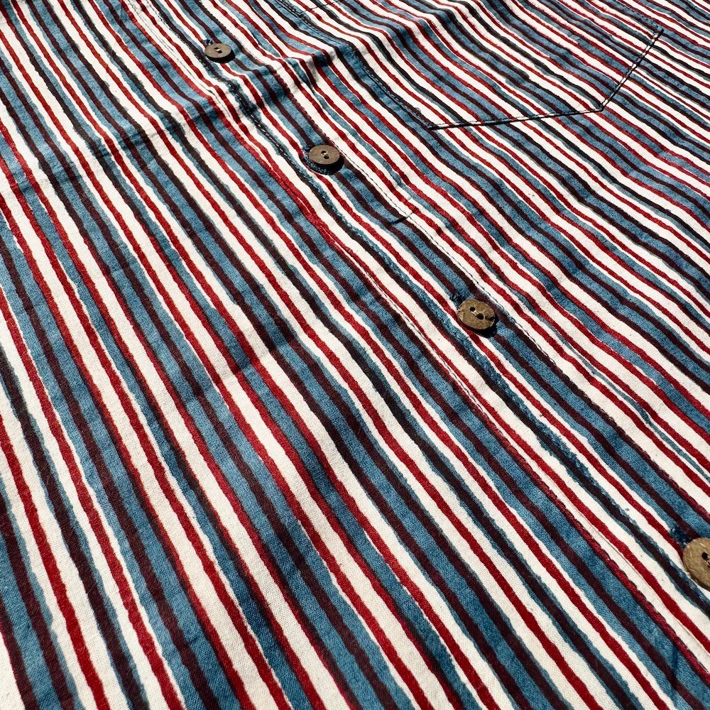 Cotton shirt hand printed by wood blocks. Natural dyes are used while dying the fabric. Due to them being printed by hand, small imperfections are present in the shirt. These bring the design to life and make each shirt one of a kind. Our shirts are made in Jaipur, India—a city renowned for its centuries-old tradition of block printing. Each piece reflects the care, skill, and heritage of artisans who continue this time-honored craft using hand-carved wooden blocks and plant-based dyes.